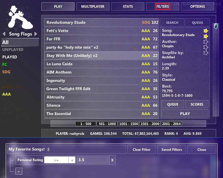 Another option is to rate them. After completing 90% or more of a song, you will be able to click the star icon next to the song title in the results screen to leave a rating. To access the songs you have rated highly, you can use the “Filters” function. View the image to the left for an example of how to filter your most liked FFR songs.