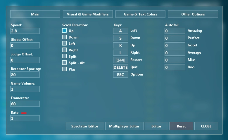 Framerate: Controls how many frames are used per second while playing a file (default 30). Choose a higher frame rate for a smoother scroll of the arrows. Changing the frame rate will not affect your global/judge offset sync, so don't worry about fiddling with those settings again after an FPS change.