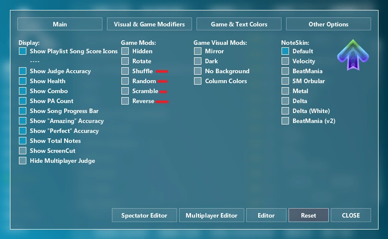 Speed: Modifications that change the rate at which the arrows scroll during gameplay. The default setting is 1x, with an option to input your own speed. By selecting 1.5x, the arrows' scroll rate is then 1.5 times faster than normal, 2x scrolls two times faster and so on. While having the arrows moving faster might not seem like an advantage at first, with a faster speed the arrows are also spaced out further, so the patterns still remain in sync with the music. This extra space allows most players to recognize patterns of close arrows better and usually improves performance.